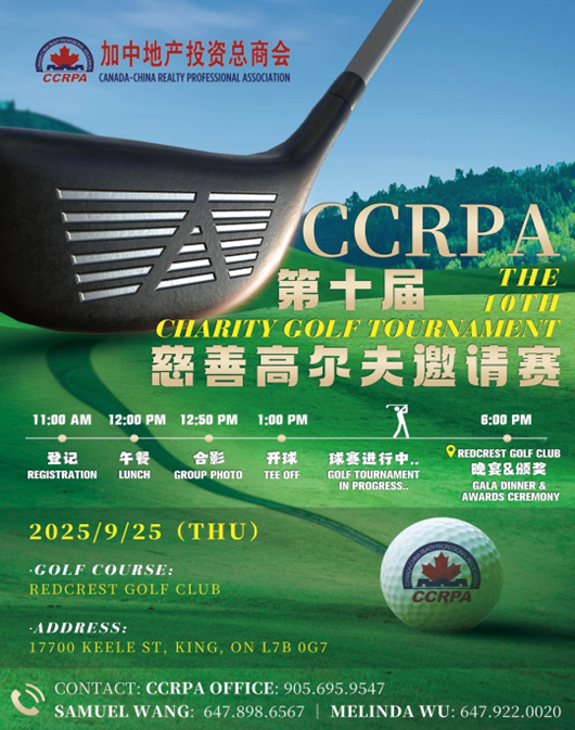 加中地产投资总商会(CCRPA)诚挚邀请地产及相关行业精英们积极参与、赞助并支持本次慈善高尔夫盛会,共同携手奉献爱心,为行业及同仁鼓舞士气,推动地产行业发展!