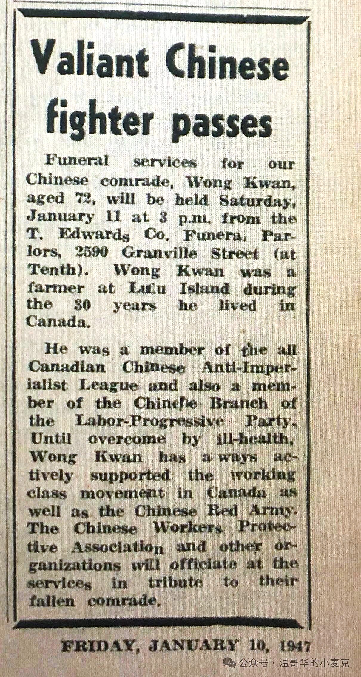 讣告纪念一位名叫“WONG KAN”的72岁华人同胞,称他是“劳工进步党华人支部的一分子”,并且“一直积极投身于加拿大的工人阶级运动和支持中国红军”,而劳工进步党就是加共于1943年至1959年之间的合法身份。