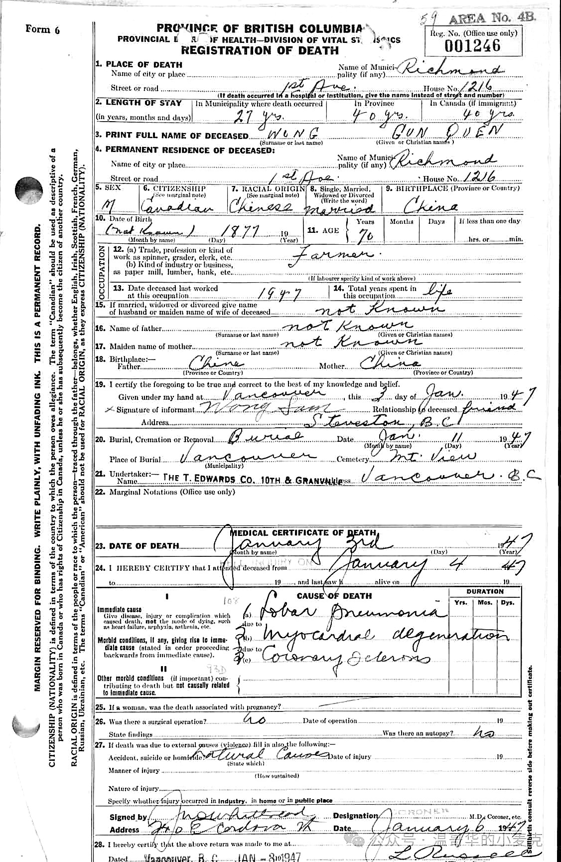 温哥华的小麦克:这是一个像侦探破案一样的过程。我根据讣告上的出院时间和地点,去公共档案馆查到了他的死亡证明,确认他的全名是Wong Gun Quen,是一位生活在列治文的农民。
