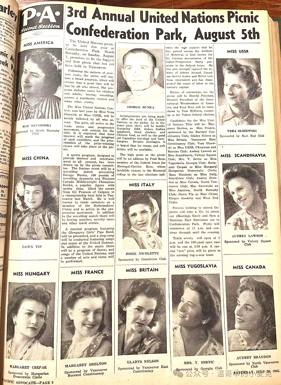 温哥华的小麦克:除了书记黄自生,还有很多闪光的名字。比如马国冠,他后来加入加拿大军队136旅赴东南亚作战,战后成为华人社区领袖,并随加拿大总理特鲁多访华,是争取华人权利的关键人物。还有几位女性成员,如Nora Low和Ann Lew,她们是当时唐人街最早的女权主义者,通过参加选美比赛等方式募集资金,用于资助华裔女性教育和维权,勇敢地打破了传统的性别枷锁。
