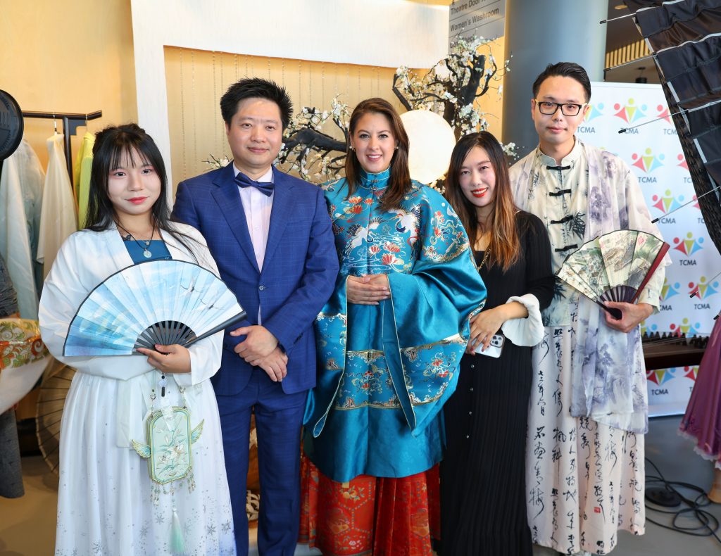 图为联邦国会国会议员桑德尔(中)身穿汉服与主办方负责人及演员合影