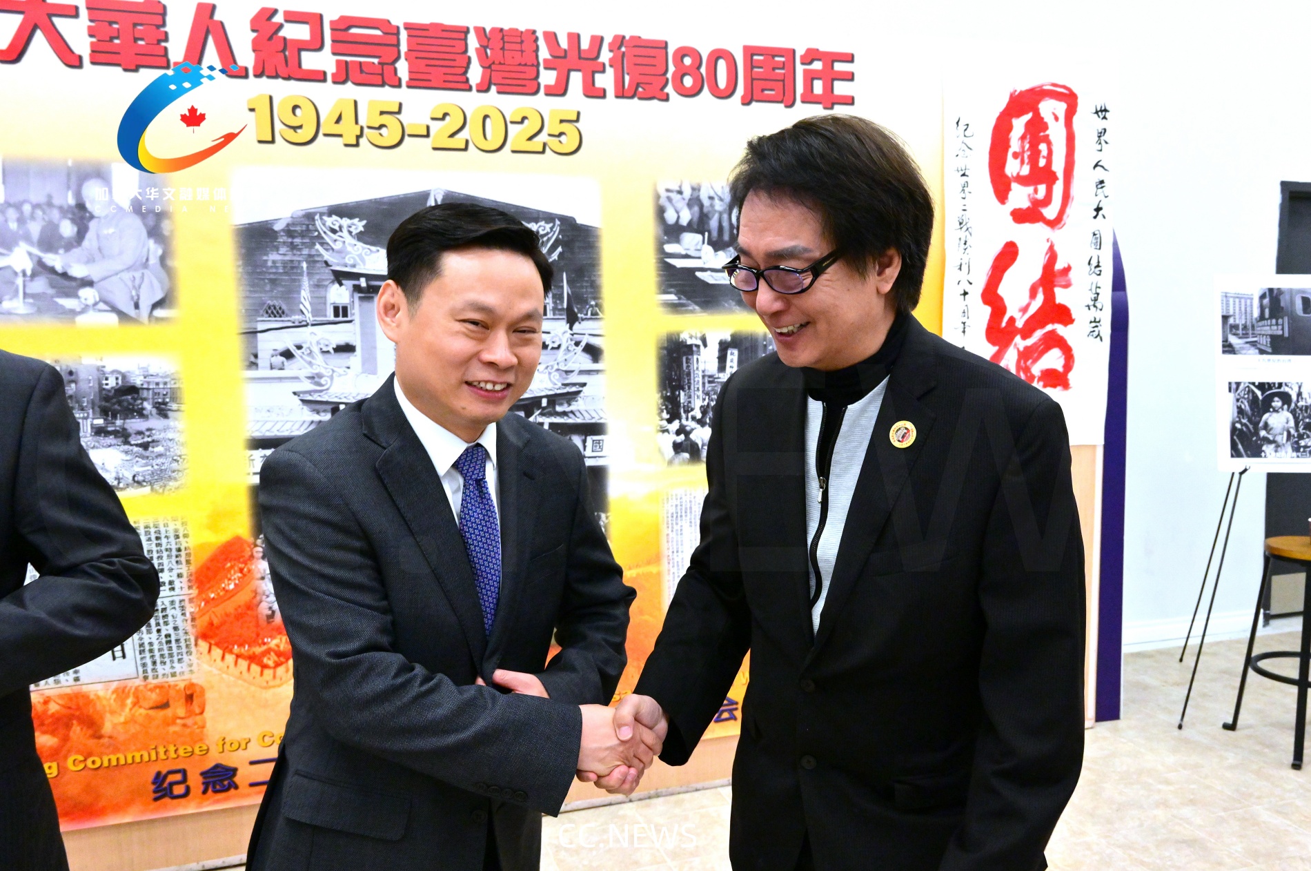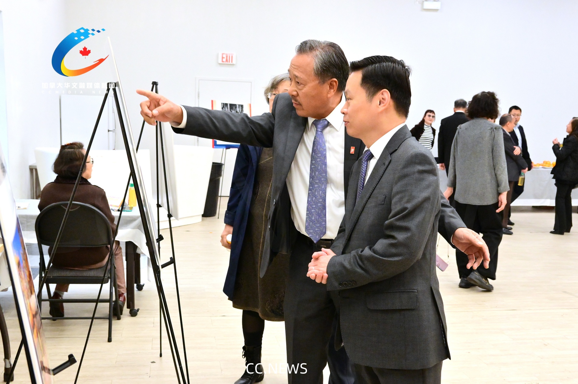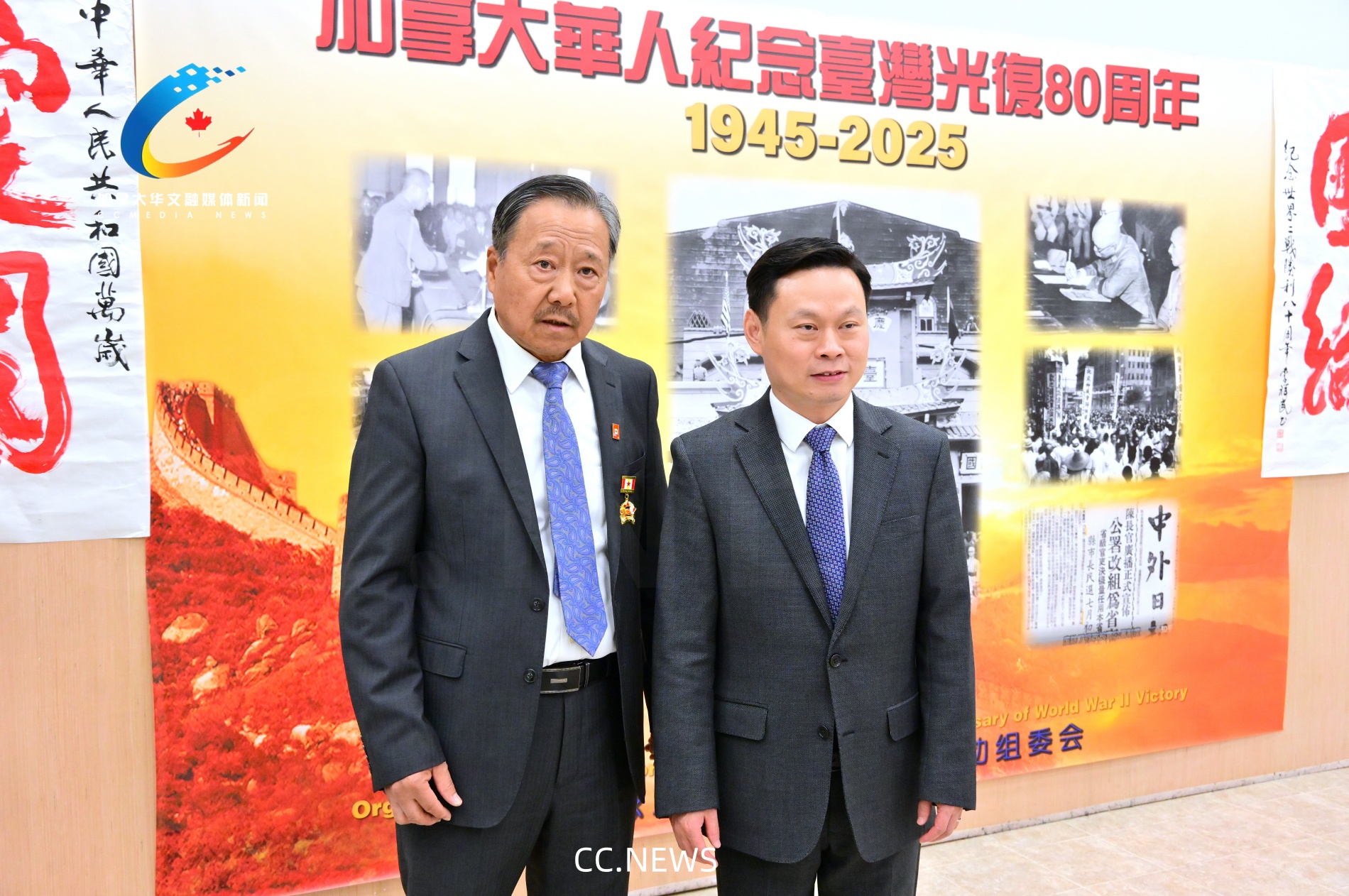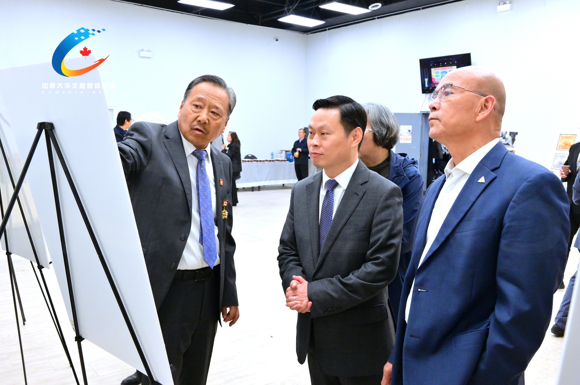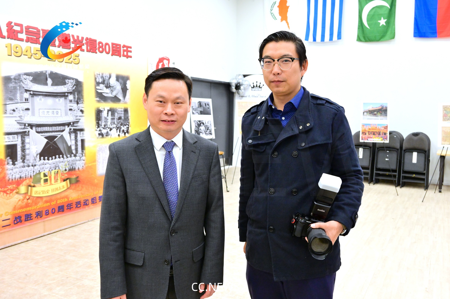 加拿大纪念二战胜利80周年活动组委会主席张俭陪同中国驻多伦多代总领事程洪波参观图片展