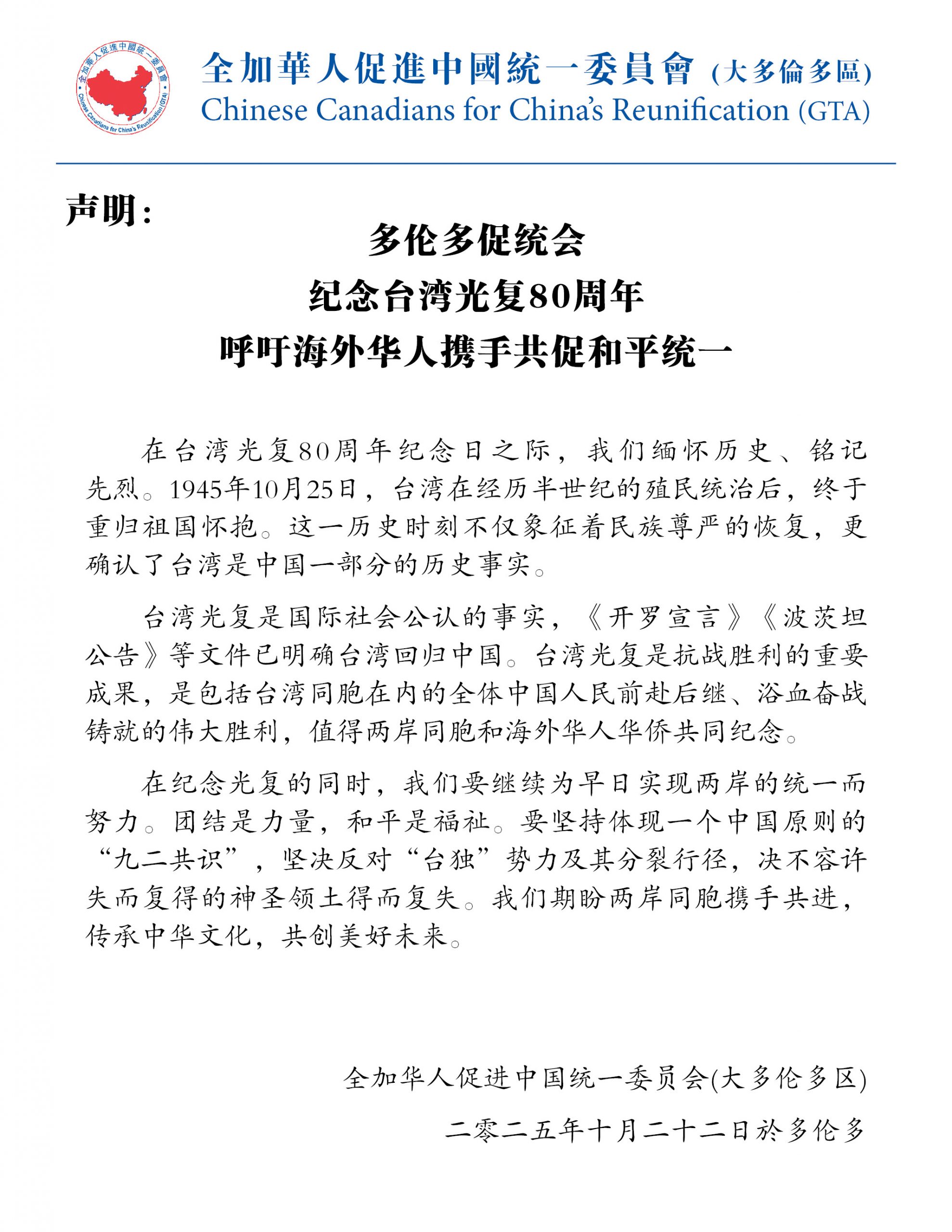 全加华人促进中统一委员会(大多伦多区)发表声明,多伦多促统会纪念台湾光复80周年呼吁海外华人携手共促和平统一